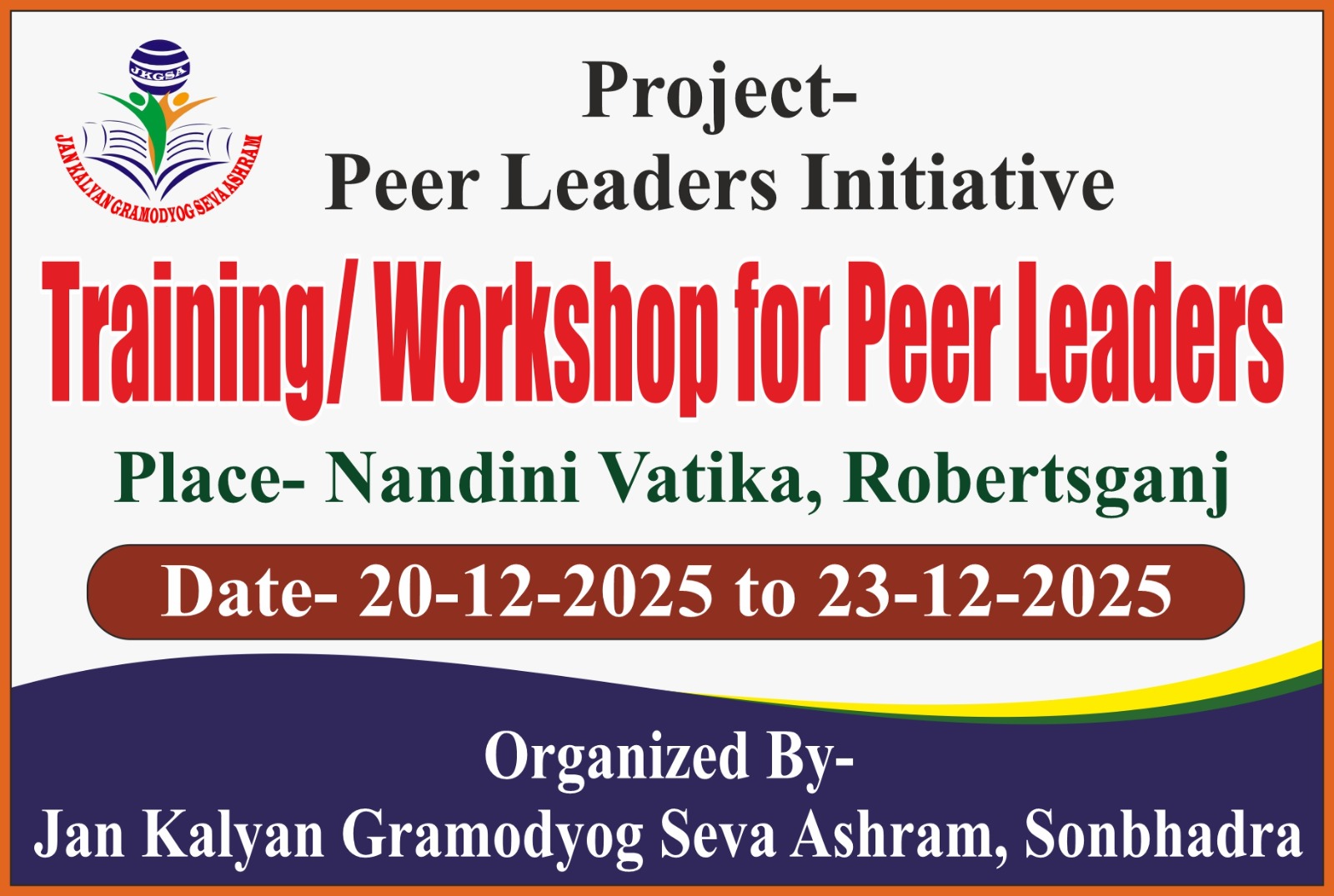 सोनभद्र। – जन कल्याण ग्रामोद्योग सेवा आश्रम, सोनभद्र द्वारा संचालित पीयर लीडर इनीशिएटिव परियोजना के अंतर्गत पीयर लीडर (महिला कार्यकर्ता) का चार दिवसीय आवासीय अभिमुखीकरण कार्यशाला 20-23 दिसंबर 2025 तक नंदिनी वाटिका मैरेज लॉन, पकरी, रॉबर्ट्सगंज में आयोजित होगी।इस कार्यशाला में 24 पीयर लीडर (महिला कार्यकर्ता) और 5 संस्था के ट्रेनर (पुरुष कार्यकर्ता) भाग लेंगे। इसका मुख्य उद्देश्य पीयर लीडर्स की क्षमता वृद्धि, नेतृत्व विकास, सामाजिक जागरूकता और सामुदायिक सहभागिता को मजबूत करना है।कार्यक्रम में प्रतिभागियों को नेतृत्व कौशल, संचार क्षमता, सामुदायिक कार्य, महिला सशक्तिकरण और सामाजिक मुद्दों पर प्रशिक्षण मिलेगा। आयोजन को सुव्यवस्थित, सुरक्षित और शांतिपूर्ण ढंग से सम्पन्न करने के लिए सभी व्यवस्थाएँ की गई हैं। संस्था ने स्थानीय प्रशासन और संबंधित विभागों को भी सूचित किया है।