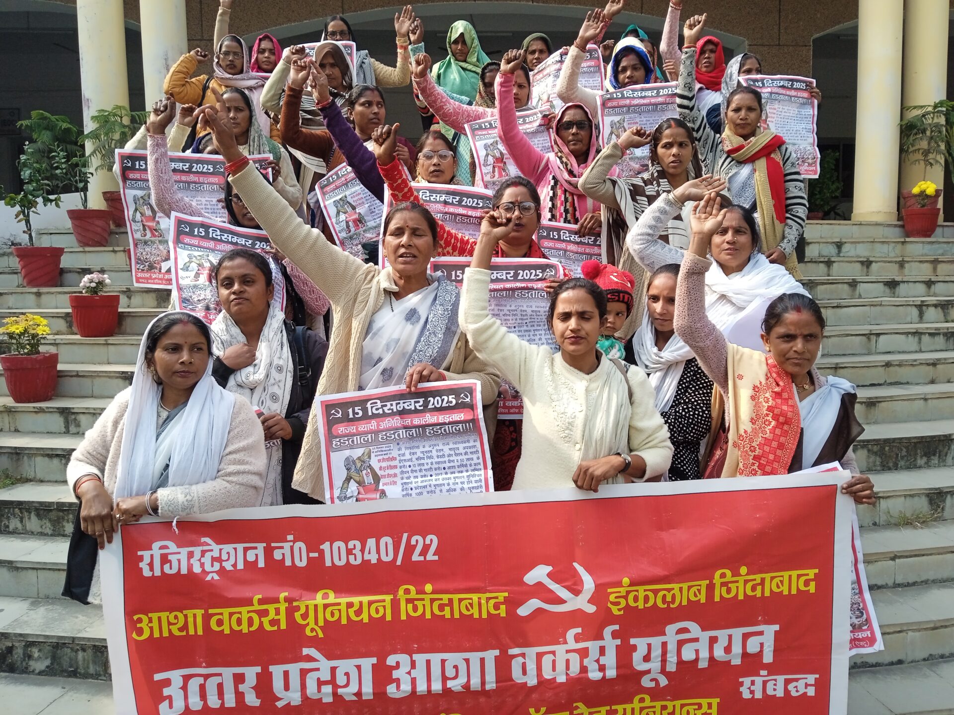 सोनभद्र। – आशा वर्कर यूनियन के बैनर तले गुरुवार को कलेक्ट्रेट परिसर में सैकड़ों आशा और आशा संगिनी ने जोरदार प्रदर्शन किया। उन्होंने अपनी 14‑सूत्री मांगों का ज्ञापन मुख्यमंत्री के नाम जिलाधिकारी प्रतिनिधि तथा सदर विधायक भूपेश चौबे को सौंपा।यूनियन के जिला अध्यक्ष ने कहा कि प्रदेश में सेवा दे रही आशा‑संगिनी को कई वर्षों से वेतन और प्रोत्साहन राशि का भुगतान नहीं किया गया। 2019 से लंबित भुगतान, आरोग्य भारत योजना के तहत किए गए योगदान के बावजूद 225 करोड़ रुपये का बकाया, तथा आयुष्मान कार्ड व आभा आई‑डी निर्माण में उनके योगदान को नज़रअंदाज़ किया गया। उन्होंने बताया कि कई बार ज्ञापन देने के बाद भी सरकार ने त्रिपक्षीय वार्ता में कोई रुचि नहीं दिखाई, जिससे कर्मियों को हड़ताल के लिए विवश होना पड़ा।प्रदर्शन में तारा देवी, जानकी देवी, रिजवाना बेगम, सुमित्रा गीता, सविता कुसुम, चंचल शांति, राधिका मीणा आदि ने भाग लिया। प्रदर्शनकारियों ने सरकार की अनदेखी और आशा कर्मियों के उत्पीड़न के खिलाफ बुलंद आवाज़ उठाई, और अपनी मांगों के समाधान तक आंदोलन जारी रखने का संकल्प लिया।