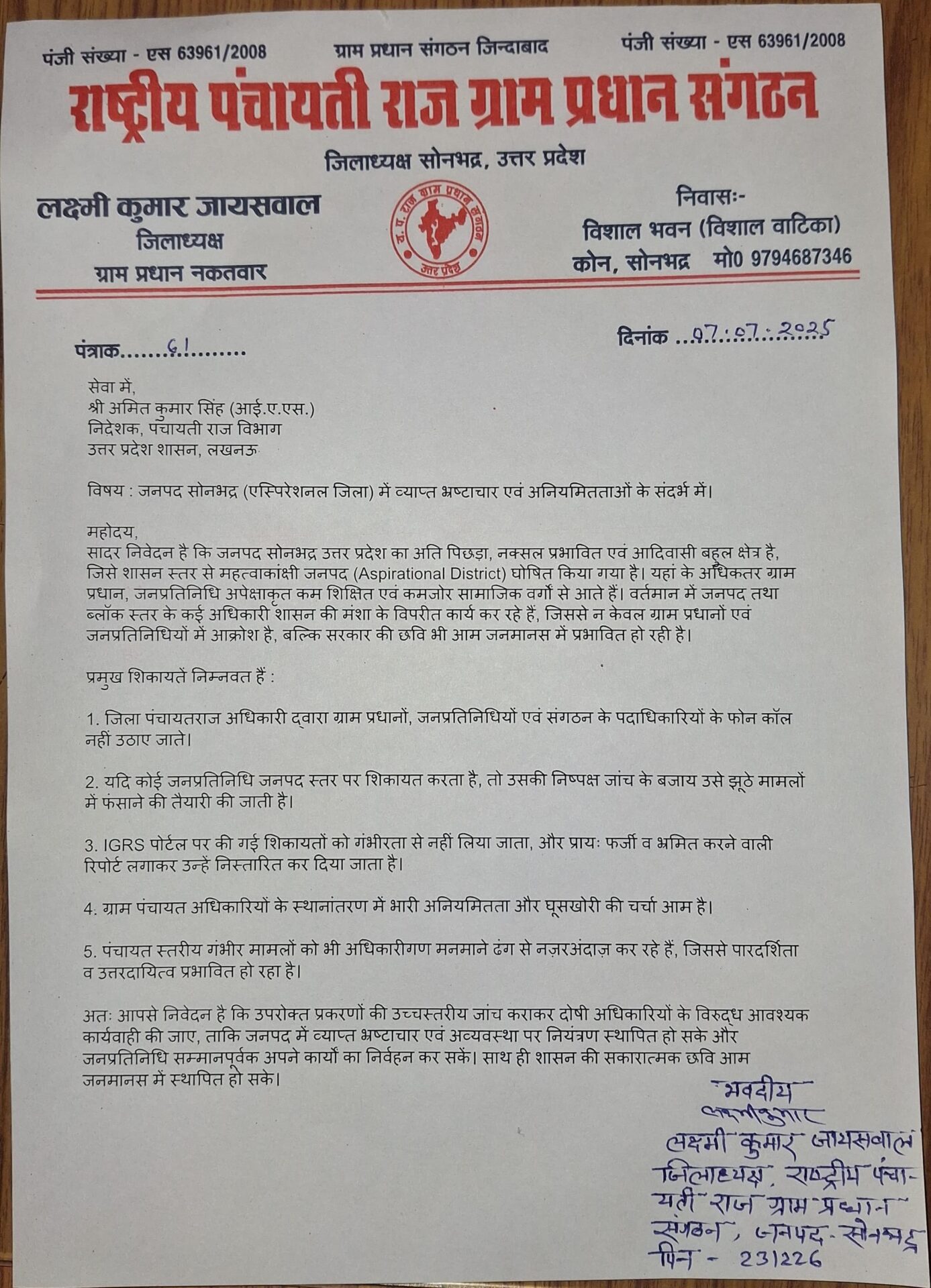 आकांक्षी जिला में भ्रष्टाचार चरम पर, प्रधान संघ के जिलाध्यक्ष ने निदेशक पंचायती राज को भेजा पत्र