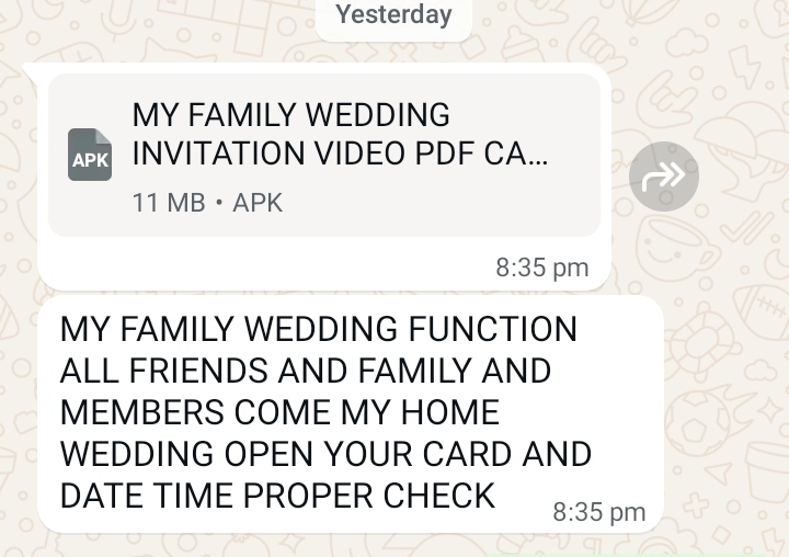 सोनभद्र। समाजवादी पार्टी के वरिष्ठ नेता पूर्व जिला पंचायत अध्यक्ष अनिल यादव का सोमवार देर शाम साइबर अपराधियों ने व्हाट्सएप मोबाइल हैंग कर लिया और संबंधित व्हाट्सएप मोबाइल में नंबरों पर मैसेज भेज कर शादी का निमंत्रण भेजा। साइबर अपराधियों ने लिखा, “मेरे परिवार के शादी समारोह में सभी मित्र, परिवार और सदस्यों का स्वागत है। घर पर शादी में पधारें। कार्ड खोलें और तिथि और समय की जानकारी प्राप्त करें।” इस मैसेज को खोलते ही अकाउंट के पैसे गायब हो सकते हैं। अनिल यादव ने देर रात व्हाट्सएप ग्रुप में मैसेज भेज कर लोगों को सावधान किया है। पुलिस साइबर टीम द्वारा ऐसे अपराधियों के खिलाफ अभियान चलाया जा रहा है और लोगों को जागरूक किया जा रहा है।