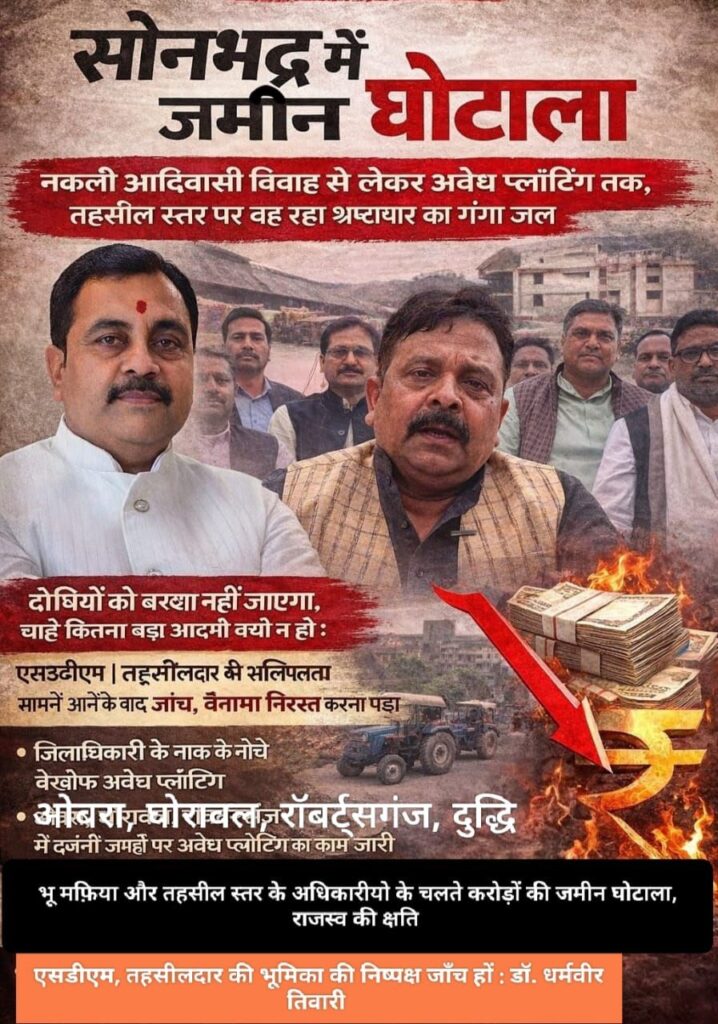 भूमि घोटाले की परतें तब और खुलीं, जब दुद्धी तहसील में आदिवासी जमीन हड़पने का चौंकाने वाला मामला सामने आया।