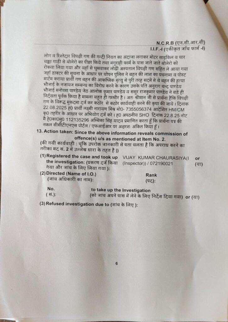 इस जानकारी पर उनसे कहा बहन जैसे है वैसे रहने दे मैं तुरन्त आ रहा हूँ तत्काल घर के कुछ अन्य सदस्यो को खबर करके अपनी मोटर साइकिल से भाग कर बहन के ससुराल गया तो देखा कि मेरी बहन को घर के अन्दर बरामदे में लेटाया गया है, वहा उसका लडका रो रहा था। बहन के शरीर पर कोई भी चद्दर नही डाला गया था। तब तक वहाँ उसके बहनोई व उसके बड़े भाई आलोक कुमार पाण्डेय व भाभी मनोरमा पाण्डेय व पिता राजकुमार पाण्डेय आ गये और बोले की कहानी खत्म है जितना जल्दी हो ले चलकर दाह संस्कार कर दिया जाये नहीं तो बेमतलब की भीड़ इकट्ठा हो जायेगी।