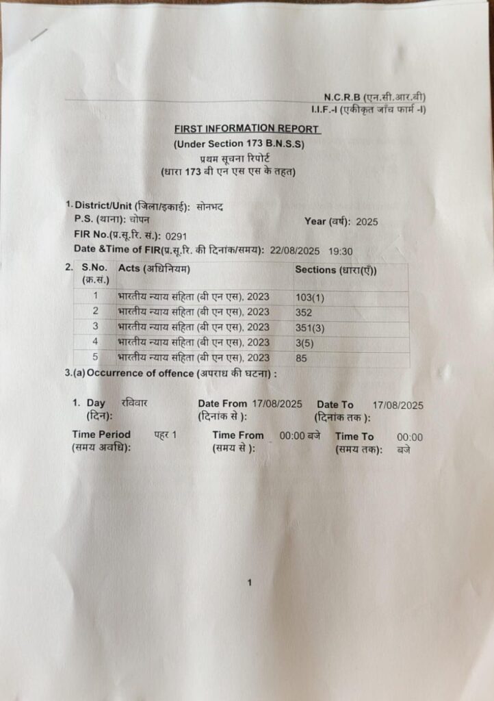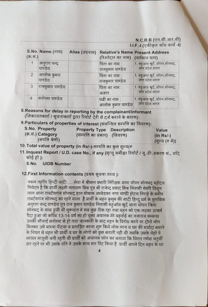 इस सम्बंध में प्रभारी निरीक्षक चोपन विजय चौरसिया ने बताया कि मृतक विवाहिता के भाई की तहरीर पर बीएनएस की धारा 103(1), 352, 3(5), 351(3) व 85 के तहत अनुराग चन्द्र पाण्डेय, आलोक कुमार पाण्डेय पुत्रगण राजकुमार पाण्डेय, मनोरमा पाण्डेय पत्नी आलोक कुमार पाण्डेय व राजकुमार पुत्र अज्ञात के खिलाफ मुकदमा दर्ज कर जांच किया जा रहा है।