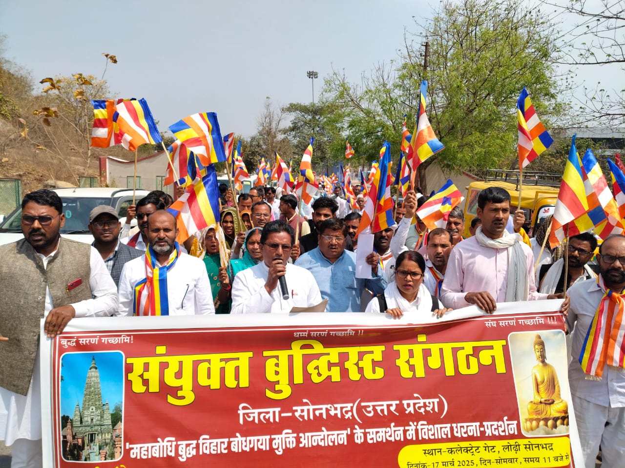 सोनभद्र । महाबोधि विहार, बोधगया में चल रहे मुक्ति आंदोलन के समर्थन में सोमवार को संयुक्त बुद्धिष्ट संगठन जनपद सोनभद्र के तत्वावधान में बौद्ध अनुयायियों ने विशाल जुलूस निकाला। यह जुलूस कलेक्ट्रेट गेट (वाराणसी-शक्तिनगर मार्ग) से शुरू होकर कलेक्ट्रेट परिसर तक पहुँचा। प्रदर्शनकारियों ने नारेबाजी करते हुए राष्ट्रपति के नाम ज्ञापन पत्र अपर जिलाधिकारी सोनभद्र को सौंपा। ज्ञापन की प्रतिलिपि प्रधानमंत्री भारत सरकार, राज्यपाल बिहार प्रदेश एवं मुख्यमंत्री बिहार प्रदेश को भी सौंपी गई।