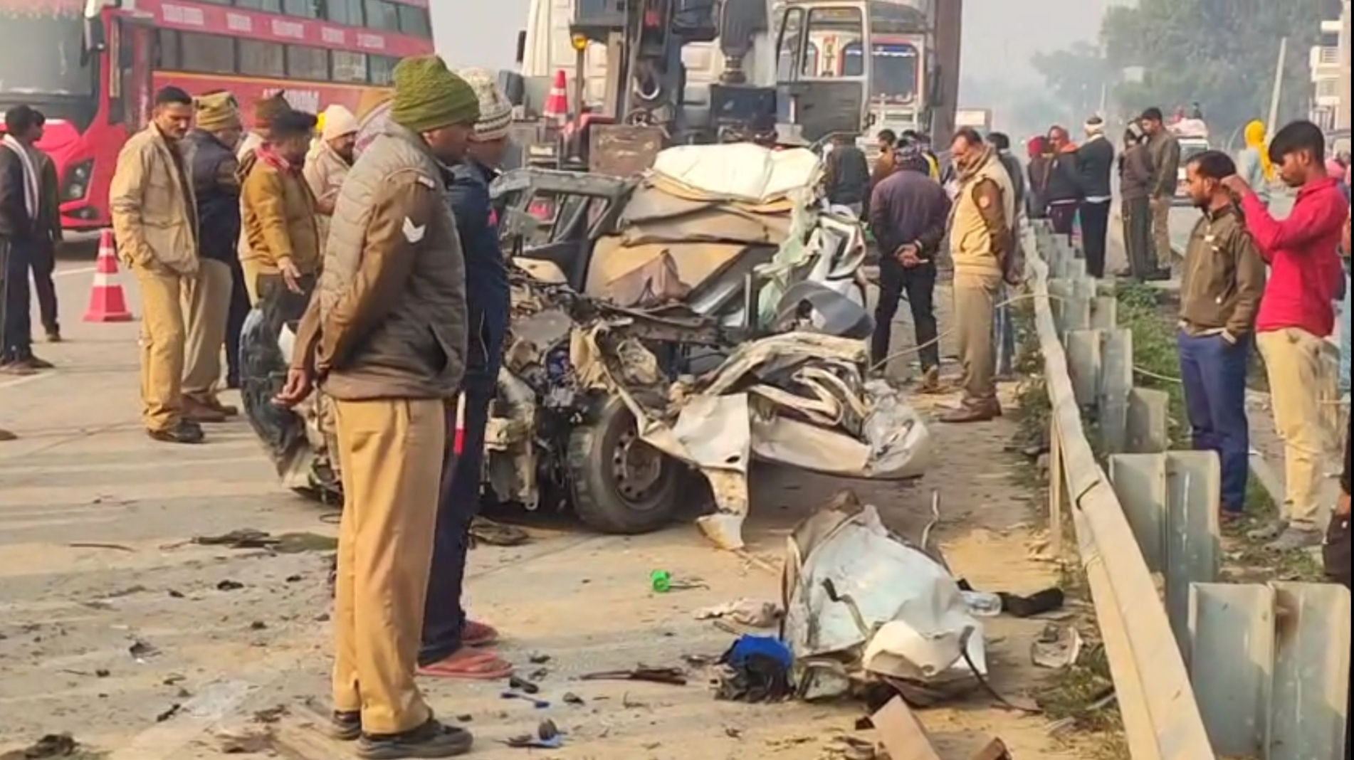 कोहरे के कारण खड़ी कन्टेनर में घुसी कार, पिता-पुत्र सहित चार की मौत
