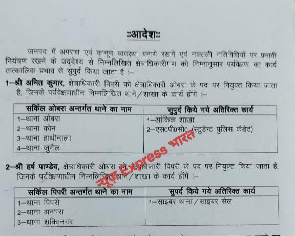 सोनभद्र। – पुलिस अधीक्षक अभिषेक वर्मा ने लाइन ऑर्डर के तहत जिले के दो क्षेत्राधिकारीयों के कार्य क्षेत्र में परिवर्तन की नई तैनाती की है। पिपरी क्षेत्राधिकारी अमित कुमार को ओबरा सर्किल का प्रभार दिया गया है, जबकि ओबरा सर्किल में रहे हर्ष पांडेय को पिपरी की जिम्मेदारी सौंपी गई है।