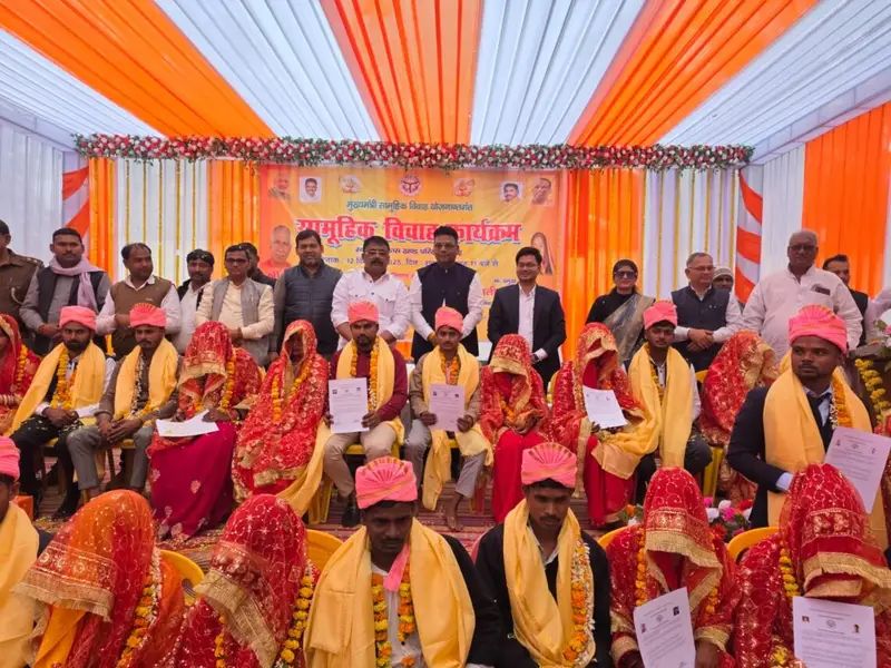 चंदौली जिले के नौगढ़ ब्लॉक परिसर में शुक्रवार को मुख्यमंत्री सामूहिक विवाह योजना के तहत भव्य समारोह आयोजित किया गया, जिसमें कुल 25 जोड़ों ने जीवनसाथी बनने की नई यात्रा शुरू की। इनमें 24 हिंदू और एक मुस्लिम जोड़ा शामिल रहा। पूरे कार्यक्रम को मंत्रोच्चार और पारंपरिक विधि-विधान के साथ संपन्न कराया गया।