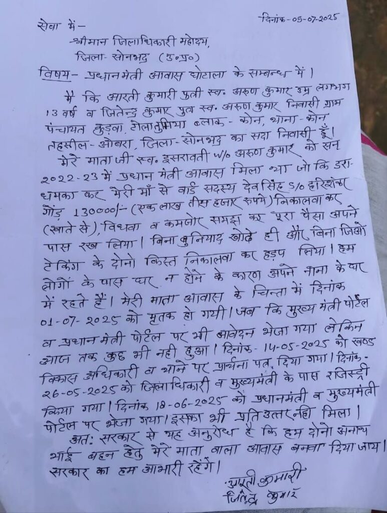 मृतका की पुत्री आरती कुमारी ने बताया कि उनकी माँ के नाम आवंटित आवास की राशि वार्ड सदस्यों और अन्य लोगों ने धोखाधड़ी से हड़प ली थी। उन्होंने बताया, “हमने प्रधानमंत्री से लेकर जिलाधिकारी तक सभी को पत्र लिखकर मदद माँगी, लेकिन कोई सुनवाई नहीं हुई। आज मेरी माँ इस व्यवस्था के खिलाफ लड़ते-लड़ते चली गई।”