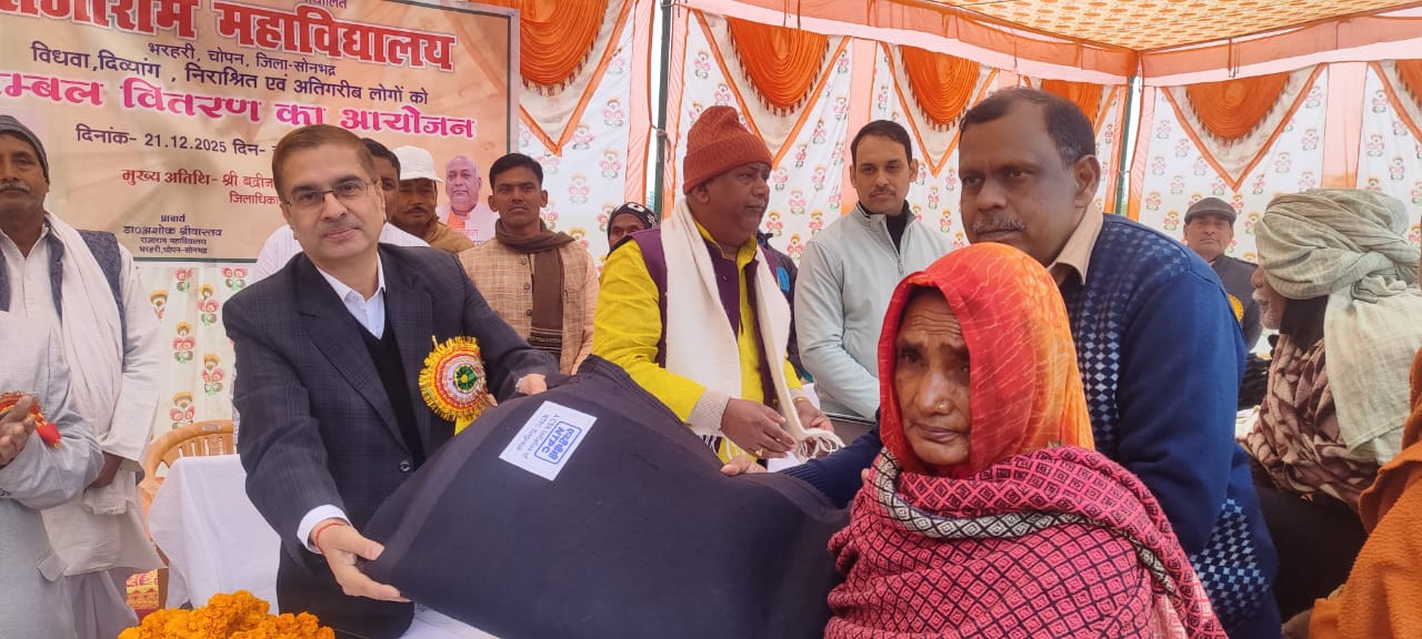 सोनभद्र। – राजाराम स्मृति सेवा न्यास समिति द्वारा संचालित राजाराम महाविद्यालय, भरहरी में रविवार को दिव्यांग, विधवा, निराश्रित गरीब 200 लोगों को शीतलहर से बचाव के लिए कंबल वितरित किए गए। कार्यक्रम के मुख्य अतिथि बी०एन० सिंह, जिलाधिकारी, विशिष्ट अतिथि हेमन्त सिंह, जिला विकास अधिकारी, जयराम सिंह, जिला विद्यालय निरीक्षक, मुकुल आनंद पांडेय, जिला बेसिक शिक्षा अधिकारी, सन्तेश कुमार राय, सहायक विकास अधिकारी सहकारिता म्योरपुर, नरेंद्र राम (तहसीलदार ओबरा), ग्राम प्रधान राम अवतार सिंह, क्षेत्रीय लेखपाल प्रवीण कुमार यादव इत्यादि लोग उपस्थित रहे। जिलाधिकारी ने सोनभद्र के भौगोलिक खासतौर पर ग्राम भरहरी के बारे में चर्चा की और महाविद्यालय से जुड़े शिक्षा के महत्व के बारे में बताया। उन्होंने शीतलहर के प्रकोप को देखते हुए ठंड से बचाव के बारे में लोगों को बताया।