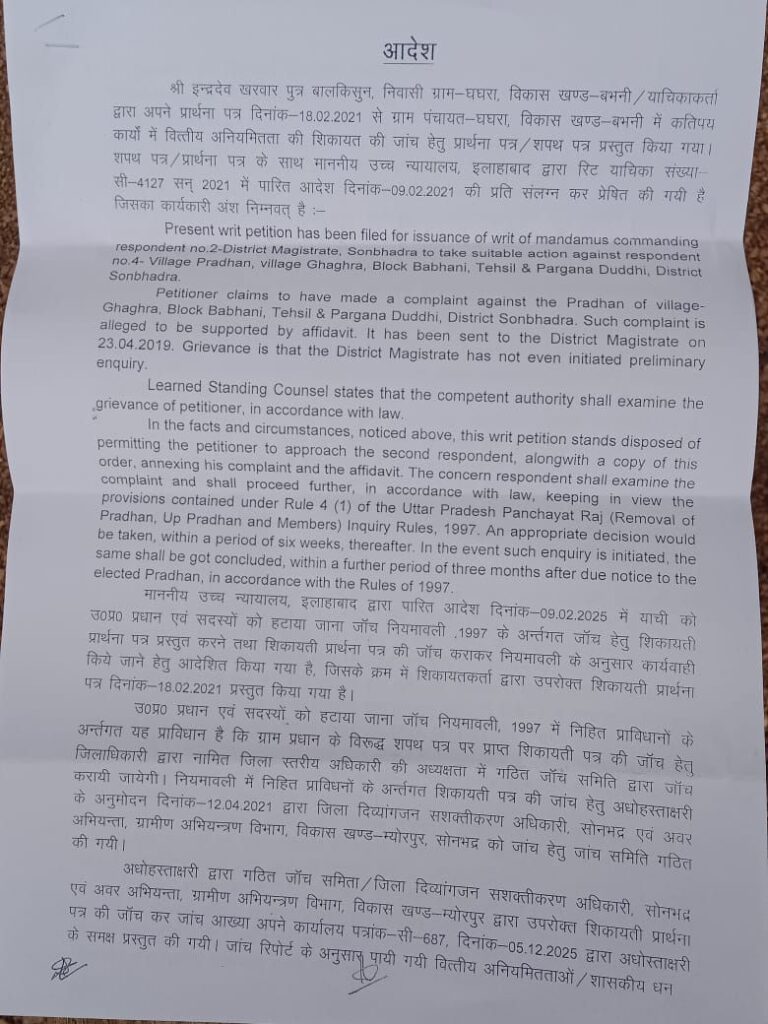 आदेश में कहा गया है कि एक माह के अंदर दोनों लोग बराबर आधे-आधे भाग में इस पैसे को ग्राम पंचायत निधि एक में जमा कराएं। यदि वह जमा करने में असफल रहते हैं तो भू राजस्व वसूली की तरह उनसे वसूली की जाए। इसी आदेश में कहा गया है कि दो परियोजनाओं पर बिना वित्तीय व प्रशासनिक स्वीकृति के कार्य करने के संबंध में तत्कालीन सचिव प्रमोद कुमार के खिलाफ विभागीय जांच करते हुए दंडनात्मक कार्यवाही की जाए। गौरतलब है कि इंद्रदेव खरवार लंबे समय से ग्राम पंचायत घघरा की अनियमितता की शिकायत जिला प्रशासन और प्रदेश सरकार को करते रहे हैं। इस संबंध में उन्होंने माननीय उच्च न्यायालय इलाहाबाद में याचिका भी दायर की थी। जिसमें उच्च न्यायालय ने जिलाधिकारी सोनभद्र को कार्रवाई करने के लिए आदेशित किया था। परिणाम स्वरूप डीएम ने जांच कराई और विकास कार्यों की लूट को अंजाम देने वाले लोगों को दंडित करने का आदेश दिया है।