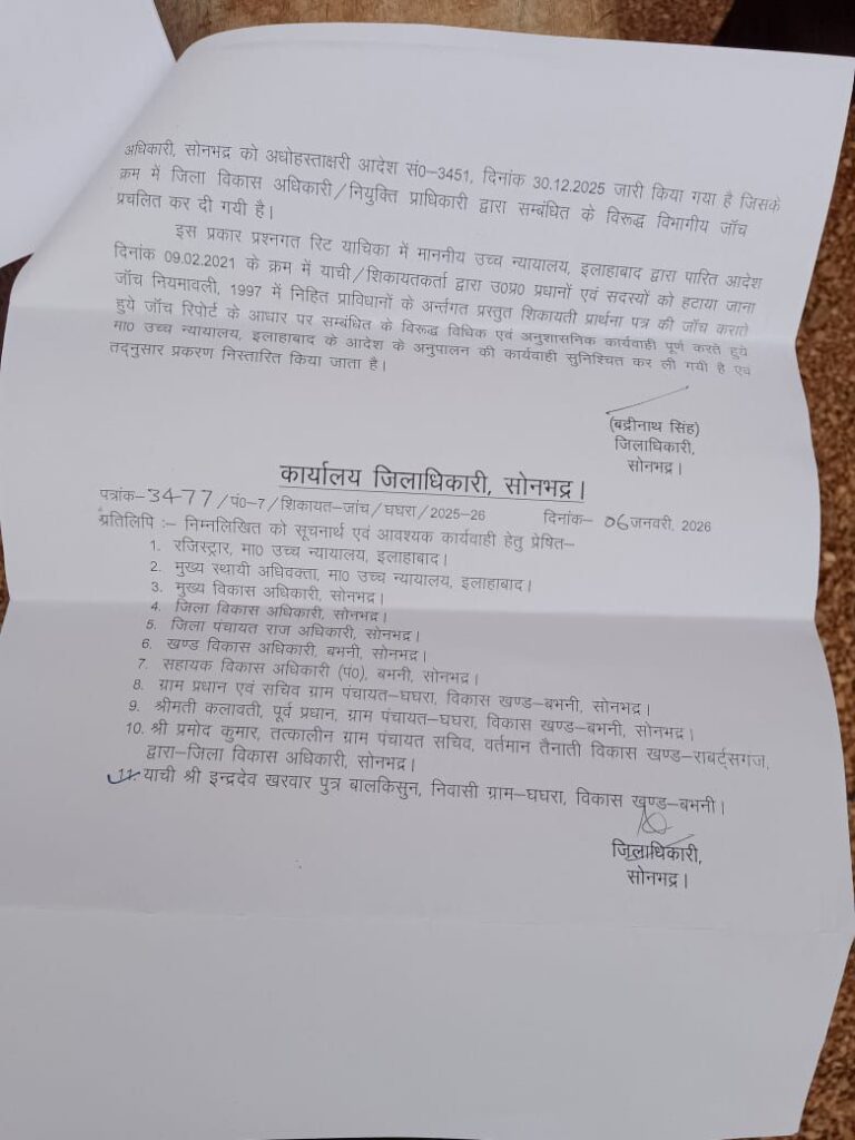 बभनी, सोनभद्र। बभनी ब्लाक के घघरा ग्राम पंचायत की निवर्तमान ग्राम प्रधान कलावती और तत्कालीन सचिव प्रमोद कुमार के ऊपर ऑल इंडिया पीपुल्स फ्रंट के जिला सचिव इंद्रदेव खरवार की शिकायत पर जिलाधिकारी सोनभद्र बद्रीनाथ सिंह ने चार लाख एक हजार सत्तासी रुपए का वसूली नोटिस जारी किया है।