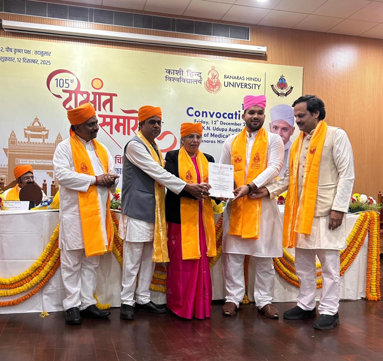 सोनभद्र। काशी हिंदू विश्वविद्यालय (बीएचयू) के 105वें दीक्षांत समारोह में जिले के पन्नूगंज थाना में तैनात सब इंस्पेक्टर श्रीकांत राय के पुत्र डॉ. आशुतोष कुमार राय को बैचलर ऑफ डेंटल सर्जरी (BDS) की डिग्री प्रदान की गई। समारोह में नीति आयोग के सदस्य व वरिष्ठ वैज्ञानिक डॉ. बी.के. सारस्वत तथा बीएचयू के कुलपति डॉ. अजीत कुमार चतुर्वेदी ने डिग्रियां सौंपी।