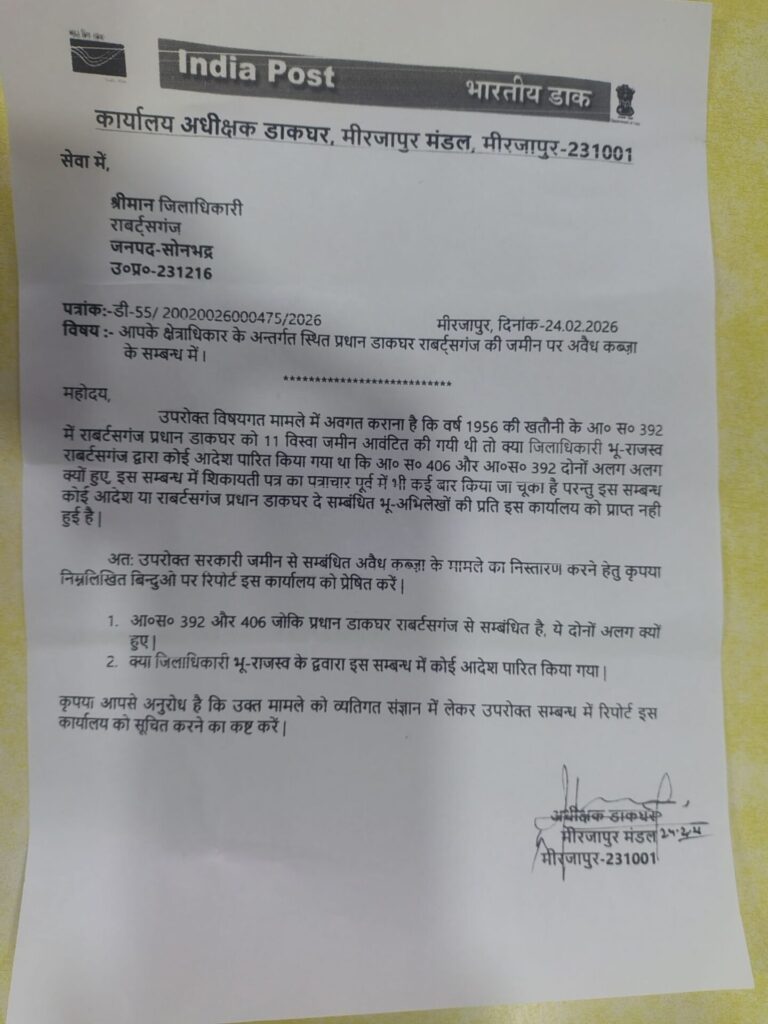 रॉबर्ट्सगंज स्थित प्रधान डाकघर की बहुमूल्य सरकारी भूमि को लेकर सामने आए दस्तावेज़, शिकायतें और विभागीय पत्राचार ने प्रशासनिक व्यवस्था को कटघरे में खड़ा कर दिया है।