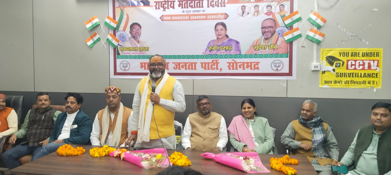 सोनभद्र,राबर्ट्सगंज। राष्ट्रीय मतदाता दिवस के अवसर पर नगर पालिका हॉल राबर्ट्सगंज में भाजपा द्वारा सम्मान समारोह का कार्यक्रम आयोजित किया गया। कार्यक्रम में सदर विधायक भूपेश चौबे, भाजपा जिला अध्यक्ष नंदलाल और नगर पालिका अध्यक्ष रूबी प्रसाद मौजूद रहे। इस अवसर पर सदर विधायक भूपेश चौबे ने कहा कि राष्ट्रीय मतदाता दिवस पर विश्व के सबसे बड़े लोकतंत्र भारत के सभी जागरूक, जिम्मेदार और सम्मानित मतदाताओं को हार्दिक शुभकामनाएं। मतदान केवल एक अधिकार नहीं, बल्कि लोकतांत्रिक मूल्यों, संवैधानिक आस्था और नागरिक कर्तव्य की सशक्त अभिव्यक्ति है। भाजपा जिलाध्यक्ष नंदलाल ने कहा कि राष्ट्रीय मतदाता दिवस हमें याद दिलाता है कि हमारे संविधान ने हर वोटर को बराबर शक्ति दी है, और सही वोट हमारे देश को सही दिशा दिखा सकता है। नगर पालिका अध्यक्ष रुबी प्रसाद ने कहा कि हम भारत के लोकतंत्र की ताकत पर विचार करते हैं, जो स्वतंत्र, निष्पक्ष और समावेशी चुनावों पर आधारित है। मैं चुनाव प्रक्रिया की पवित्रता की रक्षा के लिए भारत के चुनाव आयोग की अटूट प्रतिबद्धता की सराहना करती हूं। इस मौके पर मण्डल अध्यक्ष विनय श्रीवास्तव, नागेश्वर देव पाण्डेय, जिला महामंत्री कृष्णमुरारी गुप्ता, जिला मंत्री संतोष शुक्ला, शंम्भू नारायण सिंह, सदर ब्लॉक प्रमुख अजीत रावत, बृजेश श्रीवास्तव, अनिल सिंह, महेेश्वर चन्द्रवंशी, रजनीश रघुवंशी, बलराम सोनी, रितु अग्रहरी सहित आदि कार्यकर्ता व नव मतदातागण मौजूद रहे।