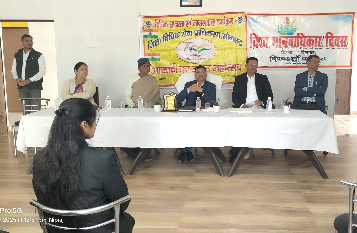 सोनभद्र। रॉबर्ट्सगंज सदर ब्लाक  अंतर्गत विन्ध्य लॉ कॉलेज, गोरडीहा में बुधवार को  अंतरराष्ट्रीय मानवाधिकार दिवस का आयोजन किया गया। कार्यक्रम के मुख्य अतिथि अपर जनपद न्यायाधीश एवं सचिव, जिला विधिक सेवा प्राधिकरण, सोनभद्र रहे, जबकि विशिष्ट अतिथि के रूप में सत्या रमण त्रिपाठी, डिप्टी चीफ डिफेंस काउंसिल, डीएलएसए, सोनभद्र उपस्थित रहे।
