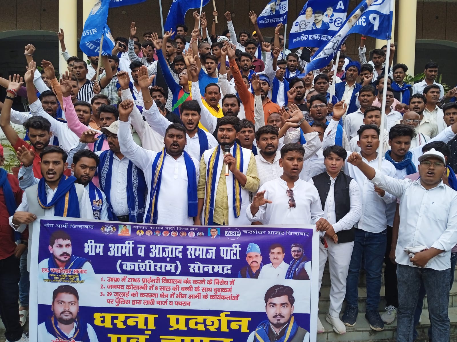 वही जिलाध्यक्ष रविकांत ने कहा कि आजाद समाज पार्टी के राष्ट्रीय अध्यक्ष चन्द्रशेखर आजाद सांसद के निर्देश पर ज्ञापन पत्र के माध्यम से निम्नलिखित मांग की जाती है। प्रदेश सरकार के द्वारा 27,965 प्राथमिक विद्यालयों को विलय करके बन्द करना यह संविधान के अनुच्छेद 21-ए, शिक्षा का अधिकार अधिनियम 2009 और अनुच्छेद 46 (कमजोर वर्गों की शिक्षा और आर्थिक हितों की सुरक्षा) के प्रावधानों का उल्लघंन है।