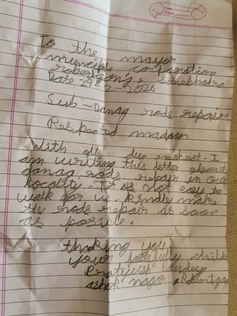 सूत्रों के अनुसार, बच्चे द्वारा सौंपे गए हस्तलिखित पत्र में इलाके की क्षतिग्रस्त सड़क की मरम्मत की मांग की गई थी। पत्र में बताया गया था कि सड़क की खराब स्थिति के कारण आम लोगों, खासकर बच्चों और बुजुर्गों को आने-जाने में भारी परेशानी हो encouraging है।