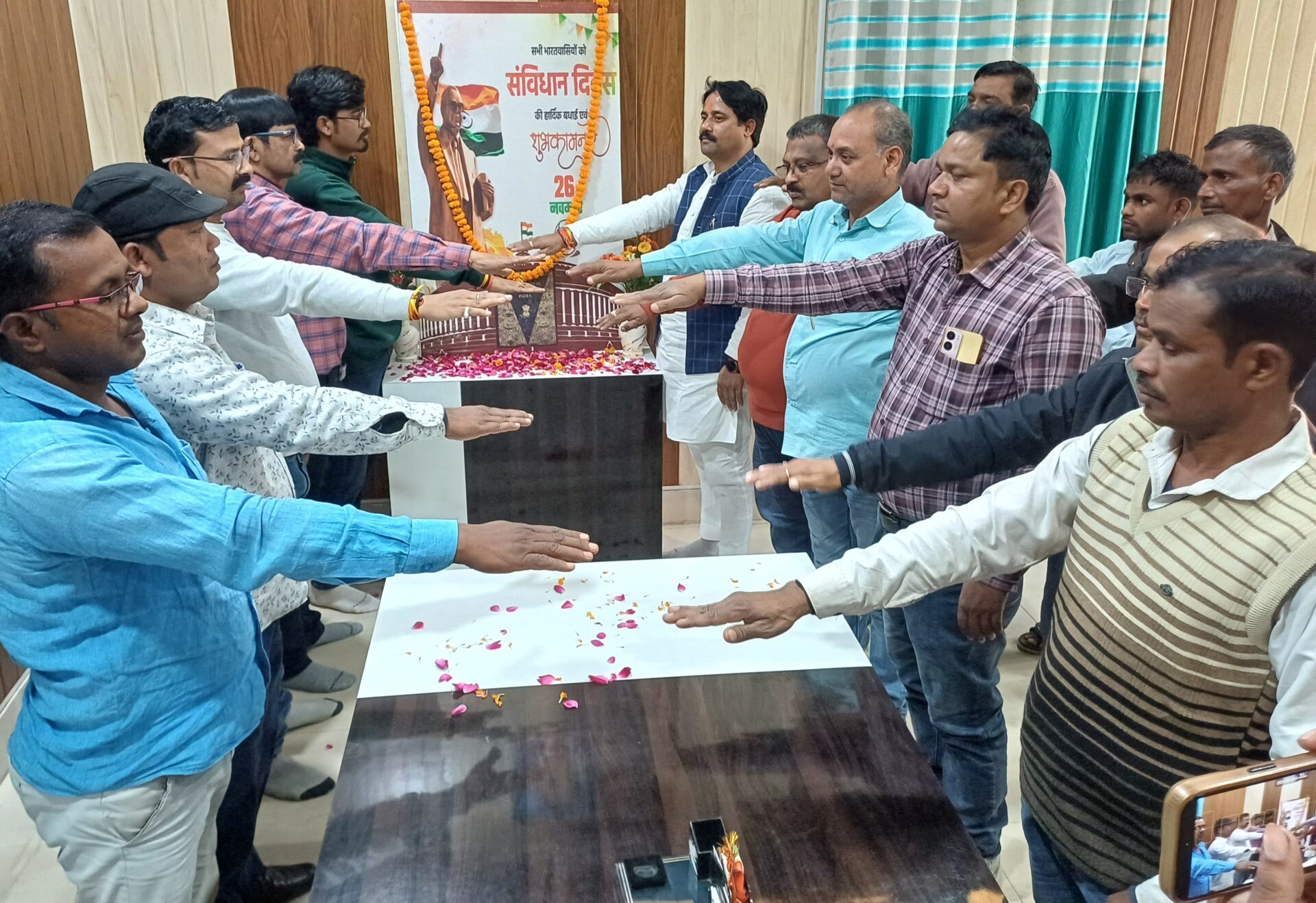 सोनभद्र(उत्तर प्रदेश)। जनपद में संविधान दिवस के अवसर पर सदर विकास खण्ड परिसर में बुधवार को भाजपा अनुसूचित मोर्चा के क्षेत्रीय अध्यक्ष एवं सदर ब्लॉक प्रमुख अजीत रावत ने डॉ. भीमराव अंबेडकर के चित्र पर पुष्प अर्पित कर उपस्थित कर्मचारियों को संविधान की प्रस्तावना का शपथ दिलाया।
