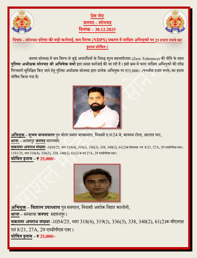 सोनभद्र। सोनभद्र पुलिस ने मगलवार को जानकारी देते हुए बताया की कफ सिरप मामले में चार आरोपियो के खिलाफ इनाम घोषित किया गया है। वही चारो आरोपियो पर 25 -25 हजार रुपये का इनाम घोषित