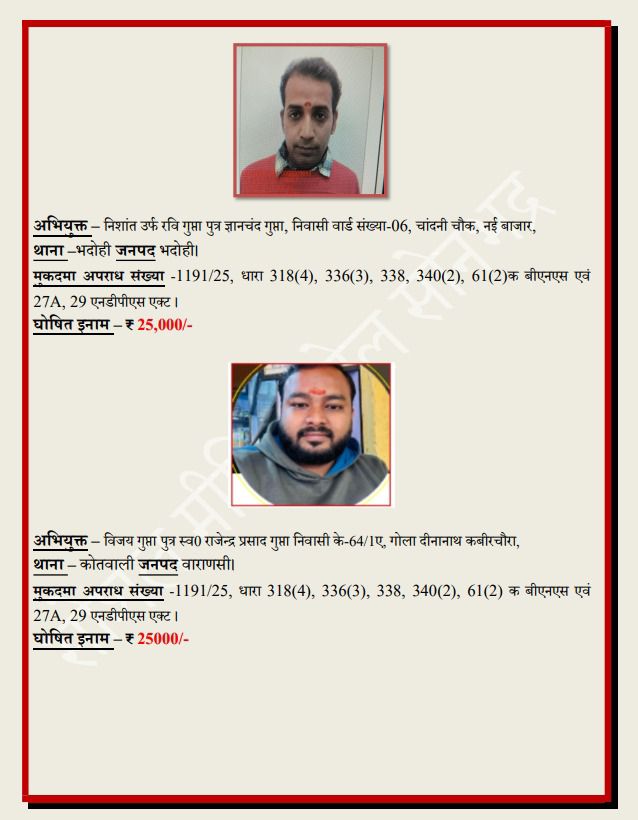 वही पुलिस अधीक्षक अभिषेक वर्मा ने किया इनाम घोषित जिसमे शुभम जायसवाल निवासी वाराणसी, विशाल उपाधयाय निवासी सहारनपुर, निशांत उर्फ रवि गुप्ता निवासी भदोही और विजय गुप्ता निवासी वाराणसी पर इनाम हुआ घोषित।