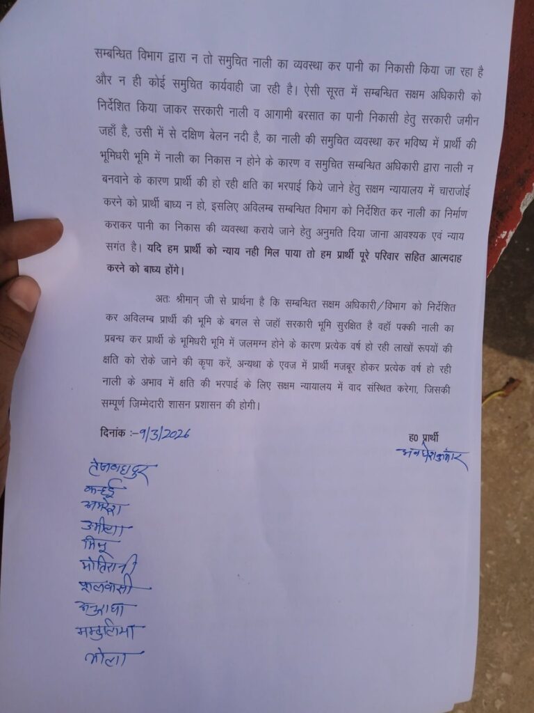 प्रार्थी मजबूर होकर उक्त प्रकरण की सूचना बीते 28.02.2026 को सी०डी०ओ० को दिया गया तथा आश्वासन दिया गया कि आपका समाधान जल्द ही कर दिया जायेगा, किन्तु आज तक सम्बन्धित विभाग द्वारा न तो समुचित नाली का व्यवस्था कर पानी का निकासी किया जा रहा है और न ही कोई समुचित कार्यवाही की जा रही है। ऐसी सूरत में सम्बन्धित सक्षम अधिकारी को निर्देशित किया जाए सरकारी नाली व आगामी बरसात का पानी निकासी हेतु सरकारी जमीन जहाँ है, उसी में से दक्षिण बेलन नदी है, वही  नाली की समुचित व्यवस्था कर भविष्य में प्रार्थी की भूमिधरी भूमि में नाली का निकास न होने के कारण व समुचित सम्बन्धित अधिकारी द्वारा नाली न बनवाने के कारण प्रार्थी की हो रही क्षति का भरपाई किये जाने हेतु सक्षम न्यायालय में चाराजोई करने को प्रार्थी बाध्य न हो, इसलिए अविलम्ब सम्बन्धित विभाग को निर्देशित कर नाली का निर्माण कराकर पानी का निकास की व्यवस्था कराये जाने हेतु अनुमति दिया जाना आवश्यक एवं न्याय सगंत है।