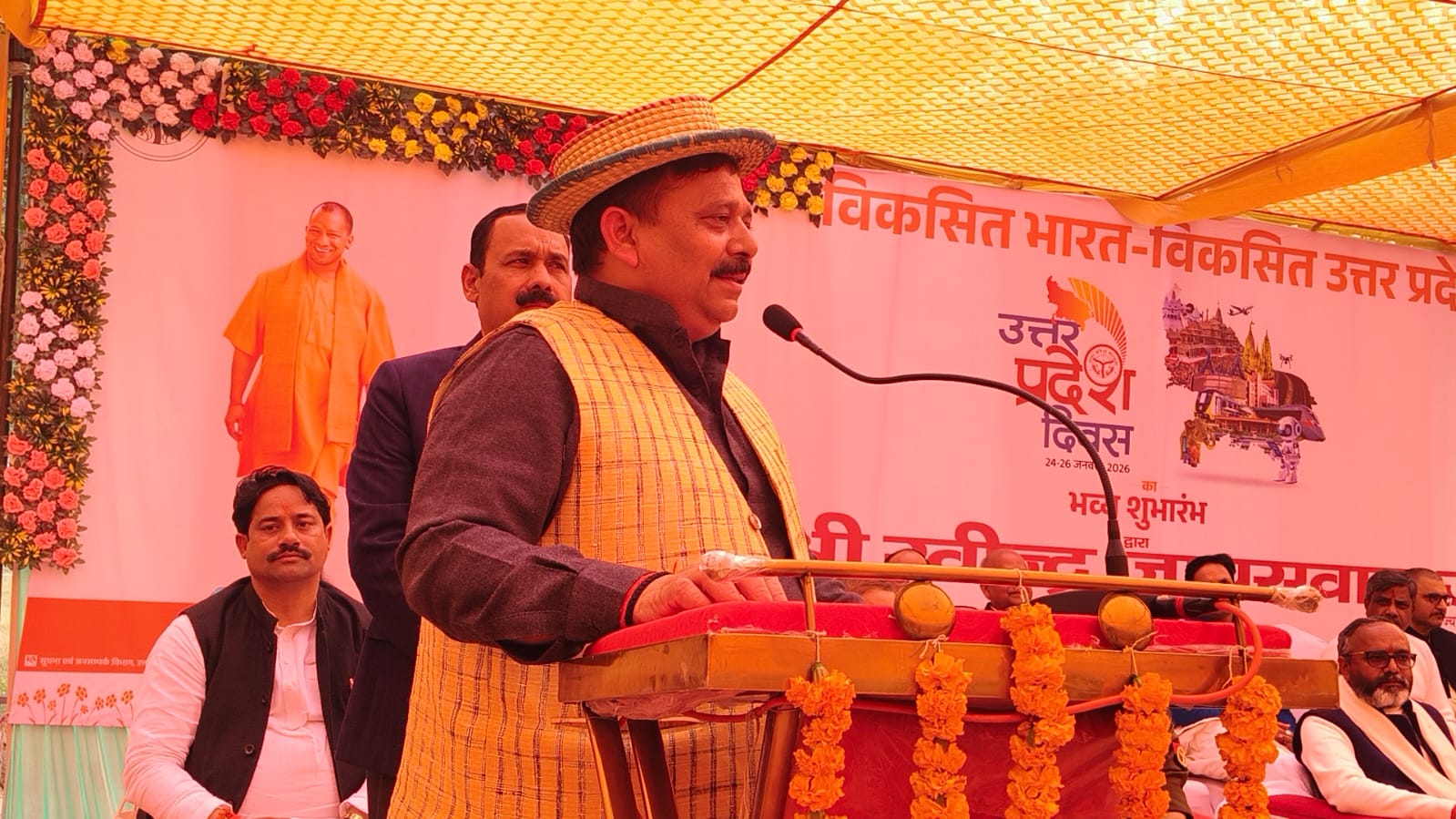 जनपद के कलेक्ट्रेट परिसर में आज उत्तर प्रदेश दिवस को गरिमामयी व भव्य तरीके से मनाया गया, कार्यक्रम के मुख्य अतिथि और जनपद के प्रभारी मंत्री रविंद्र जायसवाल ने दीप प्रज्ज्वलित कर समारोह का शुभारंभ किया। इस दौरान उन्होंने राष्ट्रगान का उल्लेख करते हुए उन्होंने कहा, विंध्य हिमाचल यमुना गंगा… यानी देश की गाथा में विंध्य का नाम स्वर्ण अक्षरों में है। जहाँ विंध्य पर्वत की चोटियाँ हों और माँ गंगा का आशीर्वाद हो, वह हमारा सोनभद्र है।