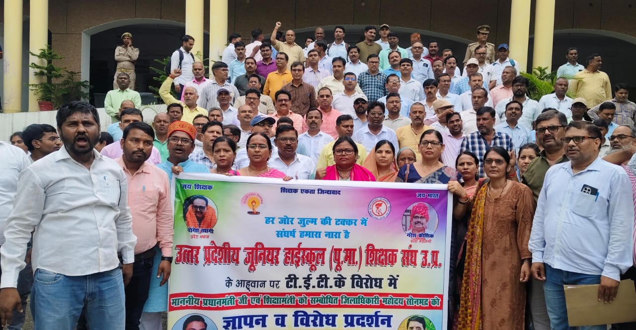 सोनभद्र(उत्तर प्रदेश)। जनपद में उत्तर प्रदेशीय पूर्व माध्यमिक शिक्षक संघ के प्रदेश नेतृत्व के आवाहन पर एवं उत्तर प्रदेशीय पूर्व माध्यमिक शिक्षक संघ के बैनर तले जिलाध्यक्ष योगेश पाण्डेय व रविभूषण सिंह के नेतृत्व में हजारों की संख्या में शिक्षक और शिक्षिकाओं ने जिला कलेक्ट्रेट पर विरोध प्रदर्शन करते हुए शिक्षा का अधिकार अधिनियम में संशोधन कर अधिनियम लागू होने से पूर्व नियुक्त शिक्षकों को टीईटी उत्तीर्ण होने की अनिवार्यता से मुक्त करने के संबंध में प्रधानमंत्री एवं शिक्षा मंत्री भारत सरकार को संबोधित ज्ञापन जिला प्रशासन को सौंपा।