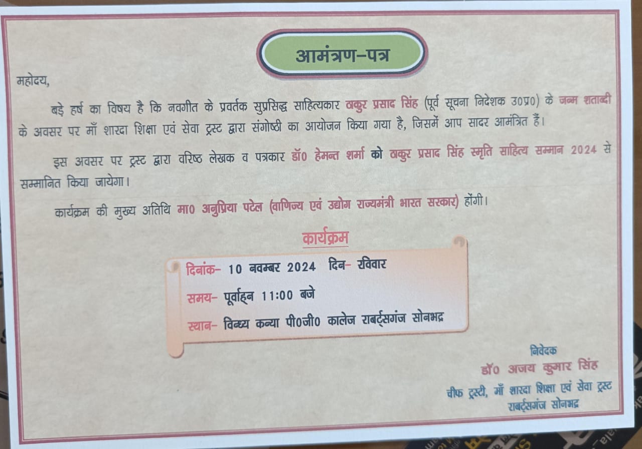 सोनभद्र(उत्तर प्रदेश)। ठाकुर प्रसाद सिंह स्मृति साहित्य सम्मान समारोह का आयोजन 10 नवम्बर रविवार को विन्ध्य कन्या पीजी कालेज परिसर में आयोजित होगा। इस सम्मान समारोह में वरिष्ठ पत्रकार व लेखक डॉ हेमन्त शर्मा को  ठाकुर प्रसाद सिंह स्मृति साहित्य सम्मान 2024 से सम्मानित किया जाएगा। यह जानकारी बुधवार को प्रबंधक डॉ अजय सिंह ने दी ।