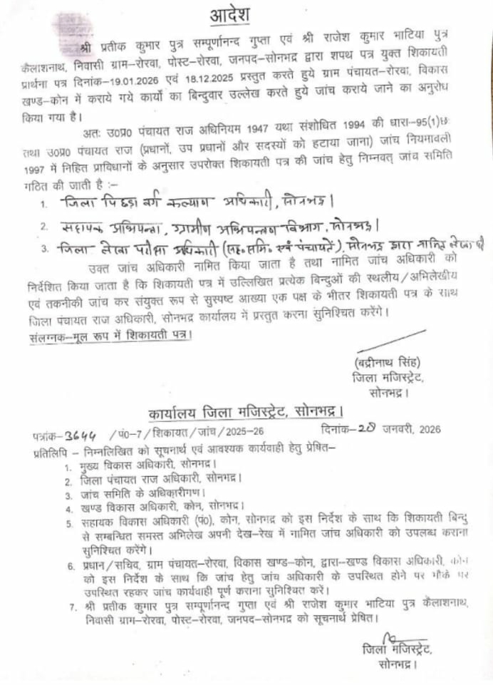 ग्राम पंचायत रोरवा में ग्राम प्रधान व प्रधान प्रतिनिधि के द्वारा ग्राम पंचायत के विकास कार्यों प्रधान मंत्री आवास, मुख्य मंत्री आवास, मनरेगा सहित लोक वित्त/राज्य वित्त में काफी अनियमितता बरतने का आरोप लगाया गया है,शिकायतकर्ता प्रतीक कुमार पुत्र सम्पूर्णानन्द गुप्ता एवं राजेश कुमार भाटिया पुत्र कैलाशनाथ, निवासी ग्राम-रोरवा, पोस्ट-रोरवा, जनपद-सोनभद्र द्वारा शपथ पत्र युक्त शिकायती प्रार्थना पत्र 18 दिसंबर और 19 जनवरी को प्रस्तुत कर ग्राम पंचायत रोरवा, विकास खण्ड-कोन में कराये गये कार्यों का बिन्दुवार उल्लेख करते हुये जांच कराये जाने का अनुरोध किया गया था। जिसको संज्ञान में लेते हुए सोनभद्र डी एम बद्रीनाथ सिंह ने उत्तर प्रदेश पंचायत राज अधिनियम 1947 यथा संशोधित 1994 की धारा-95(1) तथा उत्तर प्रदेश पंचायत राज (प्रधानों, उप प्रधानों और सदस्यों को हटाया जाना) जांघ नियमावली 1997 में निहित प्राविधानों के अनुसार उपरोक्त शिकायती पत्र की जांच के लिए टीम गठित किया है।