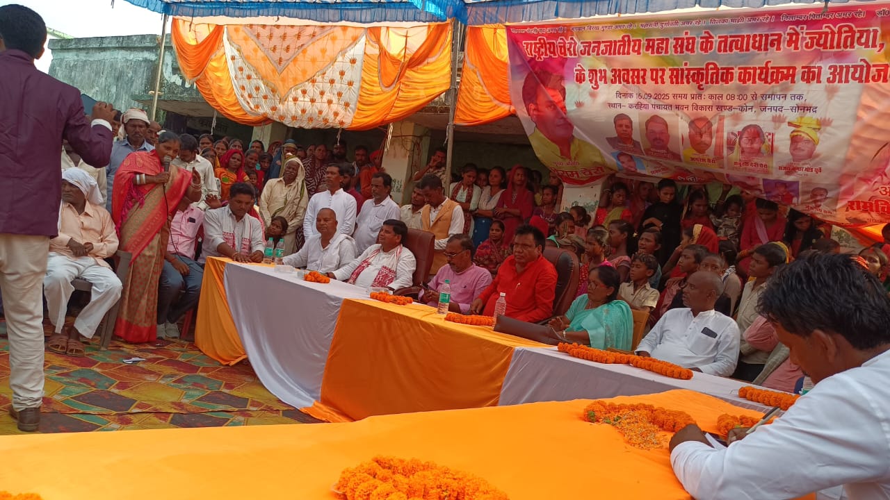कोन(सोनभद्र/उत्तर प्रदेश)। स्थानीय विकास खण्ड के करहिया ग्राम पंचायत में मंगलवार को आदिवासी समाज के लोगो द्वारा करमा देवता की पूजा व करमा डांस कर पांच कलश स्थापित करके सरना ध्वज लहराकर आदिवासी विधि विधान से बैगा पुजार व धर्माचार्य पंकज सिंह चेरो द्वारा आदिवासी विधि विधान से करम पूजा किया गया। इस पूजा में आदिवासी समाज के महापुरुषों जैसे महाराजा मेदिनी राय चेरो, भगवान बिरसामुंडा एवं संविधान निर्माता बाबा साहब के चित्र पर माल्यर्पण करने के बाद फीता जोड़कर आदिवासियों को जोड़ने का संदेश मुख्य अतिथि पूर्व विधायक व राष्ट्रीय चेरो जनजातीय महासंघ के राष्ट्रीय अध्यक्ष हरिराम सिंह चेरो ने दिया। इस दौरान चेरो आदिवासी राजवंश के राष्ट्रीय अध्यक अनीता सिंह चेरो , राष्ट्रीय संरक्षक पंकज सिंह चेरो , कबूतरी देवी ,ब्लॉक अध्यक्ष म्योरपुर मान सिंह गोंड द्वारा फीता जोड़ कर सभी आदिवासियों को एक साथ रहने,एक मंच पर अपनी आवाज बुलंद करने के लिए संदेश दिए।