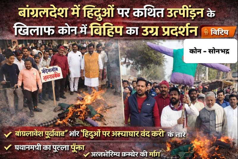 कोन (सोनभद्र)। बांग्लादेश में हिंदू समुदाय पर हो रहे कथित अत्याचारों और निर्दोष हिंदुओं की हत्या के विरोध में शुक्रवार को विश्व हिंदू परिषद के आह्वान पर कोन बाजार में जोरदार विरोध प्रदर्शन किया गया। इस दौरान सैकड़ों की संख्या में कार्यकर्ता सड़कों पर उतरे और बांग्लादेश सरकार के खिलाफ नारेबाजी करते हुए प्रधानमंत्री का पुतला दहन किया।